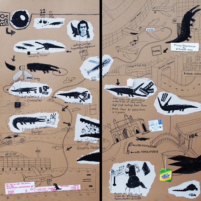 During my education at IDC, Professor Phani Tetali instructed us to visually depict our lives using two frames. I relied solely on my imagination to create and design these two pages, resulting in humorous illustrations that feature myself as a crocodile and showcase my life journey during that time. You may be wondering, "Why a crocodile?" The reason behind this choice is the crocodile's behavior - a strong and patient animal that waits for the opportune moment to hunt. This characteristic is reflective of my approach to life, as I exercise patience in all my interactions and seize opportunities when they arise.
