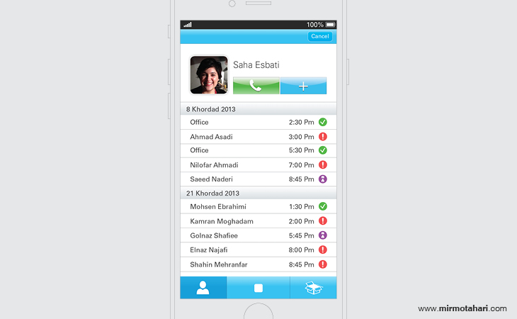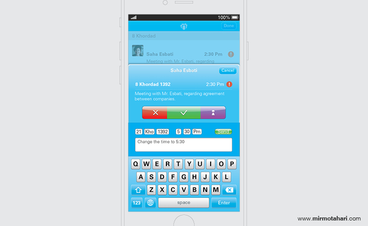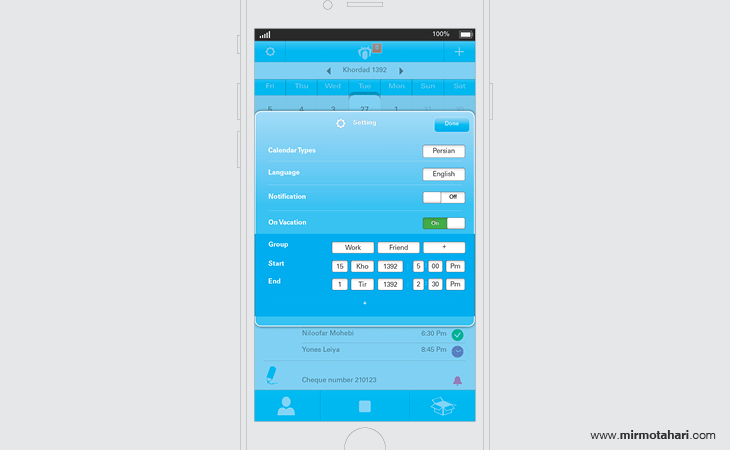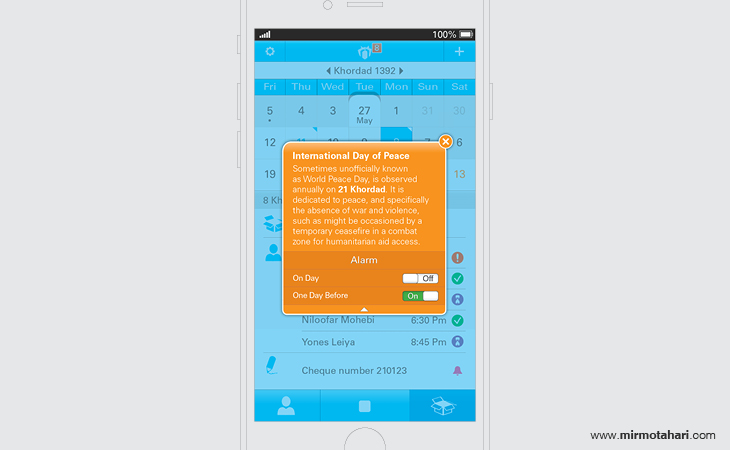 The interactive calendar, designed specifically for users of Persian calendars, offers a novel communication platform for iOS users. The calendar's mobile application allows for appointment planning, facilitating the organization of schedules. Boasting over 200 traditional events, the application has optional reminders for each of these events. Additionally, users can set their own reminders for any time of the year with the "adding event" feature, while the "writing note" feature allows users to pen notes as reminders for any day of the year.